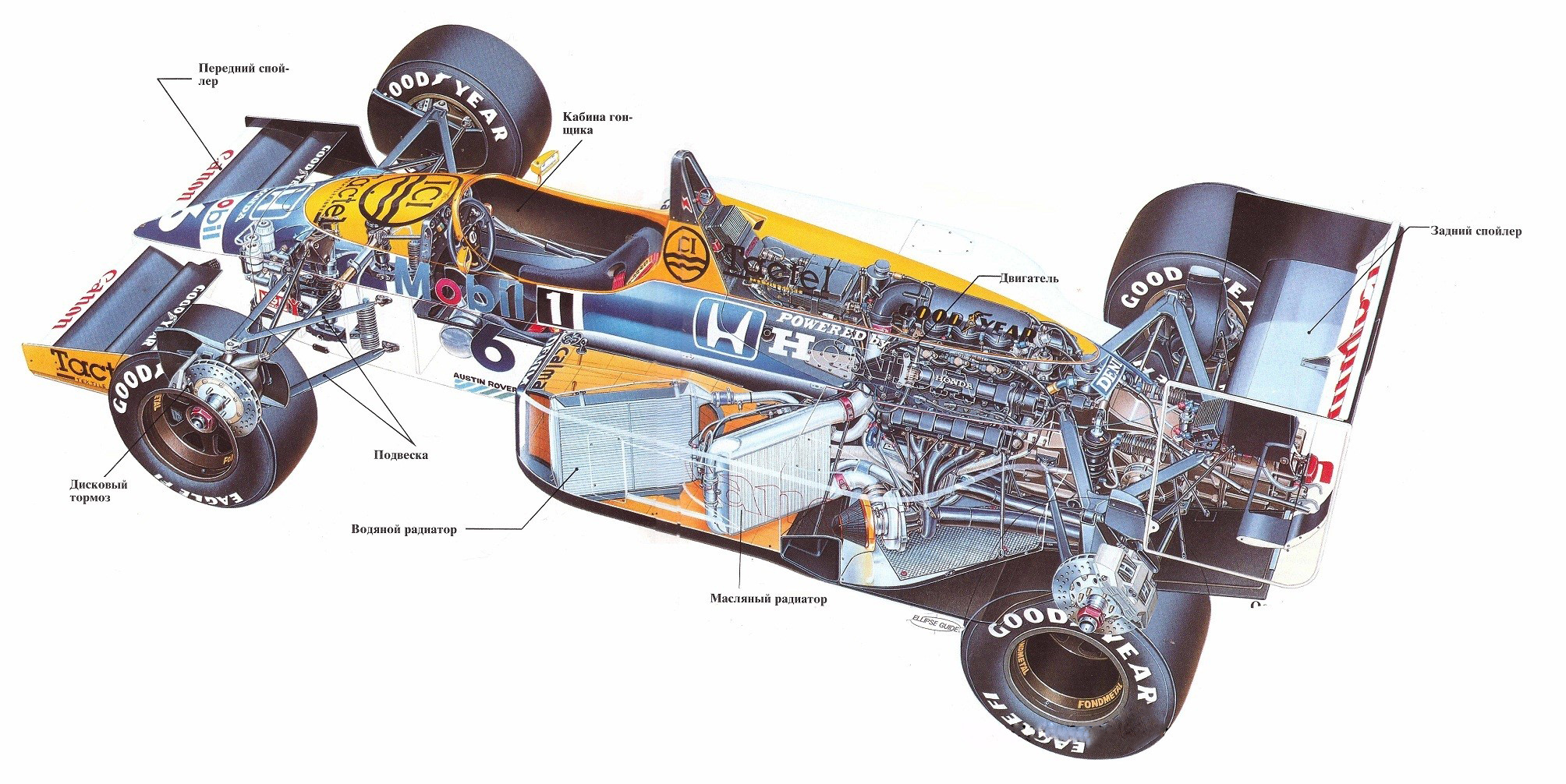 Чтобы полнее использовать огромную мощность двигателя, корпуса гоночных автомобилей имеют специальную аэродинамическую форму, призванную обеспечить минимальное сопротивление воздуха. Шины их колес делаются сверхширокими — для лучшего сцепления с дорогой и, следовательно, более безопасного движения. Особая подвеска обеспечивает устойчивость и противодействует заносу автомобиля даже тогда, когда он совершает крутые виражи на большой скорости.