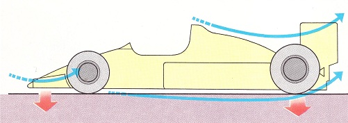 Низкие, широкие корпуса гоночных автомобилей отлиты из легкого, но прочного углеродного волокна. Форма их кузова такова, что помогает автомобилю использовать воздушный поток, который образуется при высоких скоростях. Скошенный передний край (ниже, слева) и задние обтекатели - спойлеры заставляют воздух давить на автомобиль вниз и не дают ему оторваться от земли.